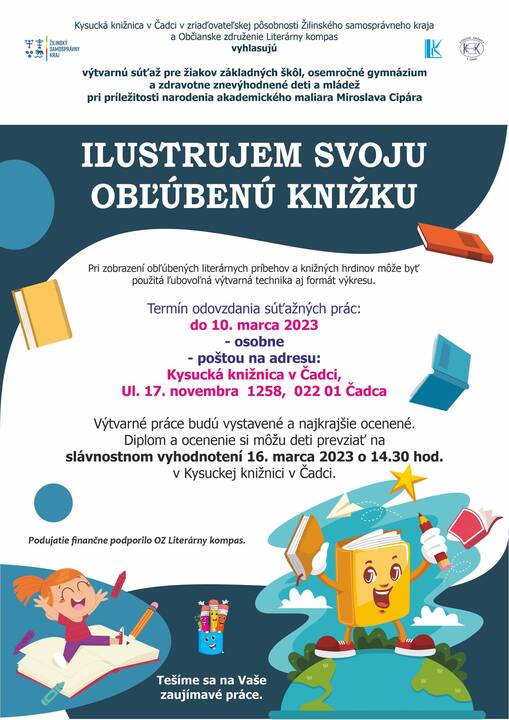 Kysucká knižnica v Čadci v zriaďovateľskej pôsobnosti Žilinského samosprávneho kraja a Občianske združenie Literárny kompas vyhlasujú výtvarnú súťaž pre žiakov základných škôl, osemročné gymnázium a zdravotne znevýhodnené deti a mládež pri príležitosti narodenia akademického maliara Miroslava Cipára ,,ILUSTRUJEM SVOJU OBĽÚBENÚ KNIŽKU".