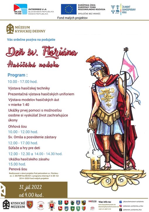 Kysucké múzeum, organizácia v zriaďovateľskej pôsobnosti Žilinského samosprávneho kraja v spolupráci s hlavným cezhraničným partnerom Hasičským záchranným sborom Moravskosliezskeho kraja a s dobrovoľnými hasičskými zbormi z Bystrickej doliny, teda z okrsku č.3, (Dunajov, Krásno nad Kysucou, Zborov nad Bystricou, Klubina, Radôstka, Stará Bystrica, Nová Bystrica, Vychylovka) pripravilo na nedeľu 31. júla 2022 podujatie Deň sv. Floriána.Nosným prvkom podujatia bude výstava hasičskej techniky pozostávajúca z exponátov hasičských zborov z Moravskosliezskeho kraja a z celej Bystrickej doliny. Popri výstave budú prezentované hasičské uniformy a ukážky zásahovej činnosti. Pre deti sme pripravili rôzne súťaže a aktivity, za ktoré ich bude čakať maličká odmena. Po celú nedeľu budú návštevníkov sprevádzať odborníci, ktorí ponúknu zaujímavý výklad a odpovedia na všetky zvedavé otázky.