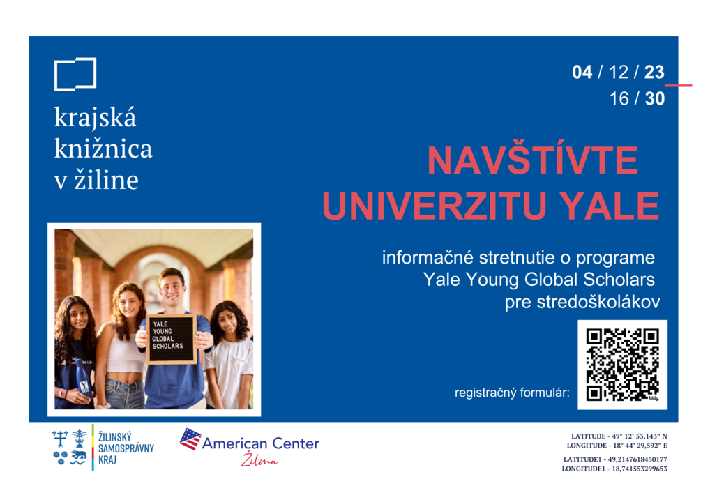 Univerzita Yale každoročne organizuje pre šikovných a talentovaných študentov z celého sveta letný program s názvom Yale Young Global Scholars. V pondelok 4. decembra 2023 o 16:30 sa v Americkom Centre Žilina uskutoční stretnutie s Jakubom Kolekom, absolventom tohto programu , ktorý podľa vlastných skúseností predstaví záujemcom proces prihlasovania aj program samotný. Na stretnutie je potrebné sa vopred prihlásiť cez kontaktný formulár.