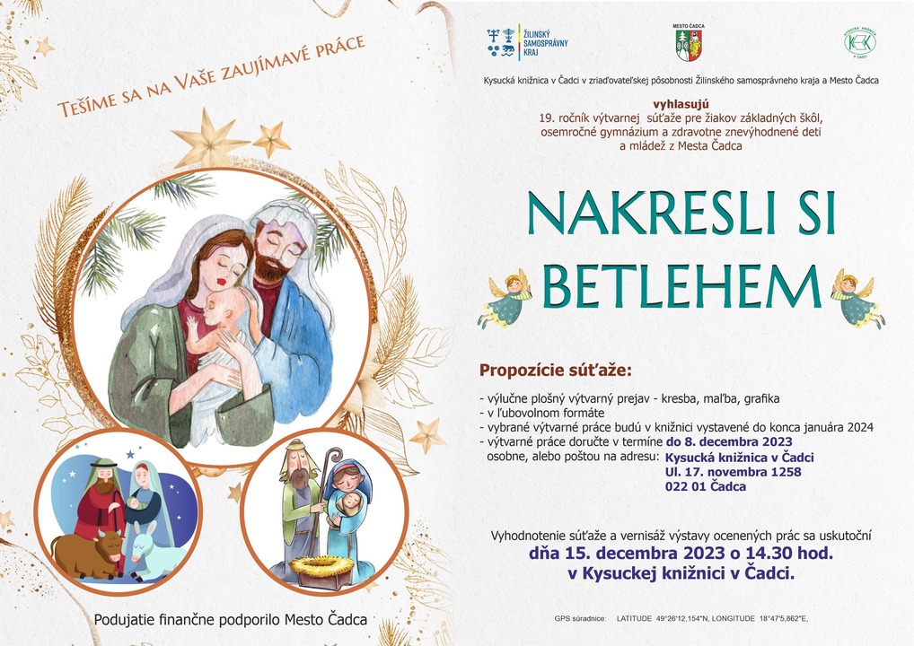 Kysucká knižnica v Čadci v zriaďovateľskej pôsobnosti Žilinského samosprávneho kraja a Mesto Čadca vyhlasujú 19. ročník výtvarnej súťaže pre žiakov základných škôl, osemročné gymnázium a zdravotne znevýhodnené deti a mládež z Mesta Čadca.