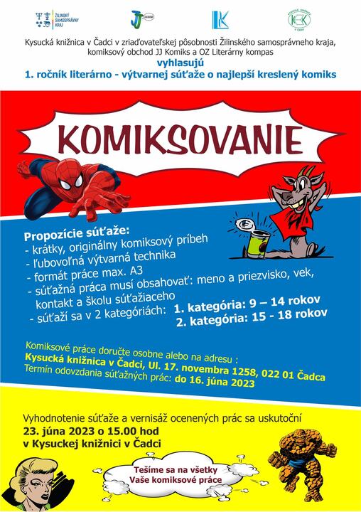 Kysucká knižnica v Čadci v zriaďovateľskej pôsobnosti Žilinského samosprávneho kraja, komiksový obchod JJ Komiks a OZ Literárny kompas vyhlasujú 1. ročník literárno - výtvarnej súťaže o najlepší kreslený komiks KOMIKSOVANIE