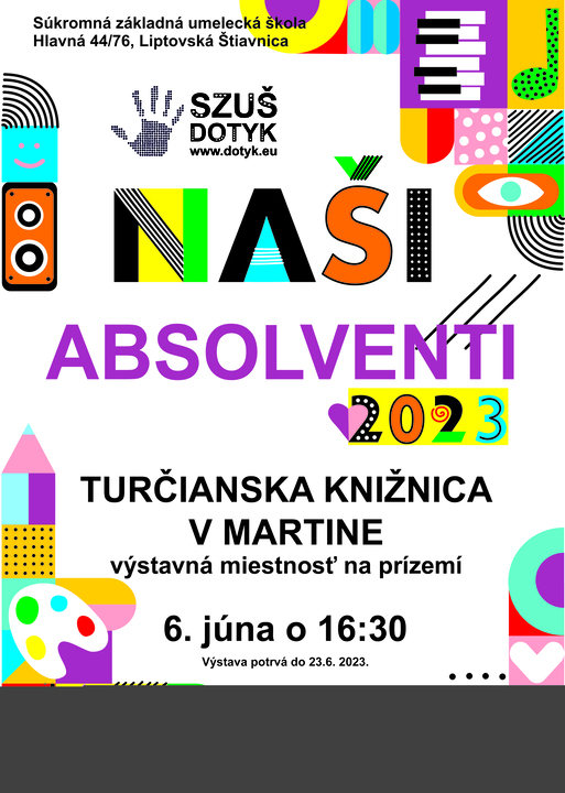 Výstava výtvarných prác absolventov výtvarného odboru SZUŠ Dotyk v Liptovskej Štiavnici.