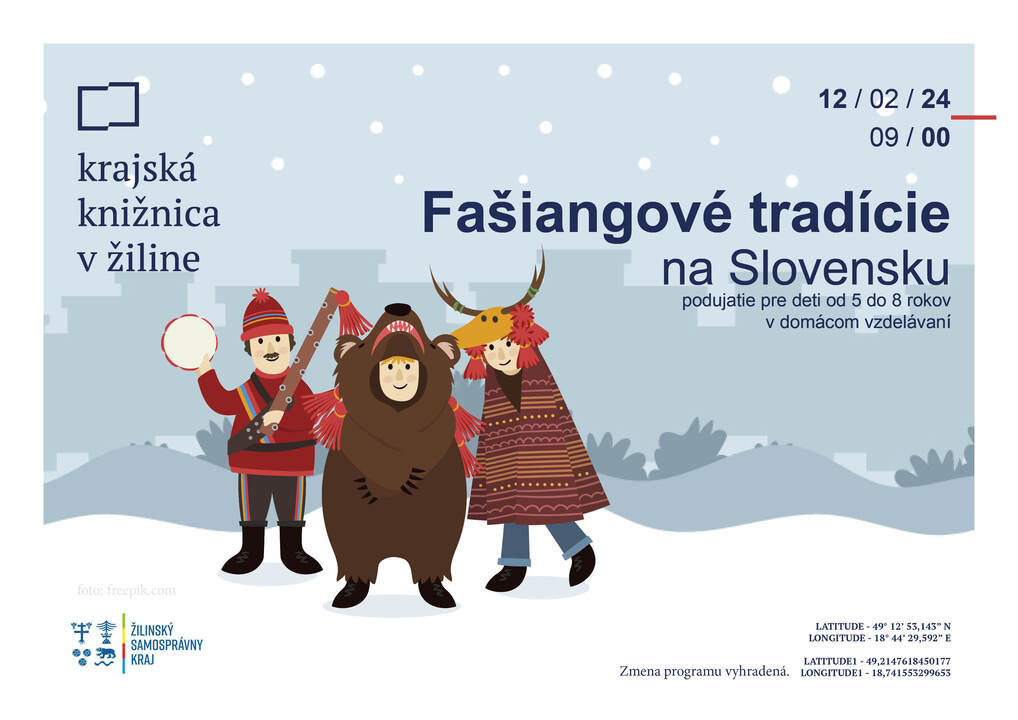Fašiangové tradície na Slovensku – Aké boli tradície v meste a aké boli na dedine? Hromnice, pochovanie basy, ľudové piesne… S deťmi sa 12. februára o 9:00 pozrieme na sviatky, ktoré patria k najtradičnejším u nás a skúsime si vyrobiť aj nejakú fašiangovú masku. Najlepšie masky oceníme sladkou odmenou.