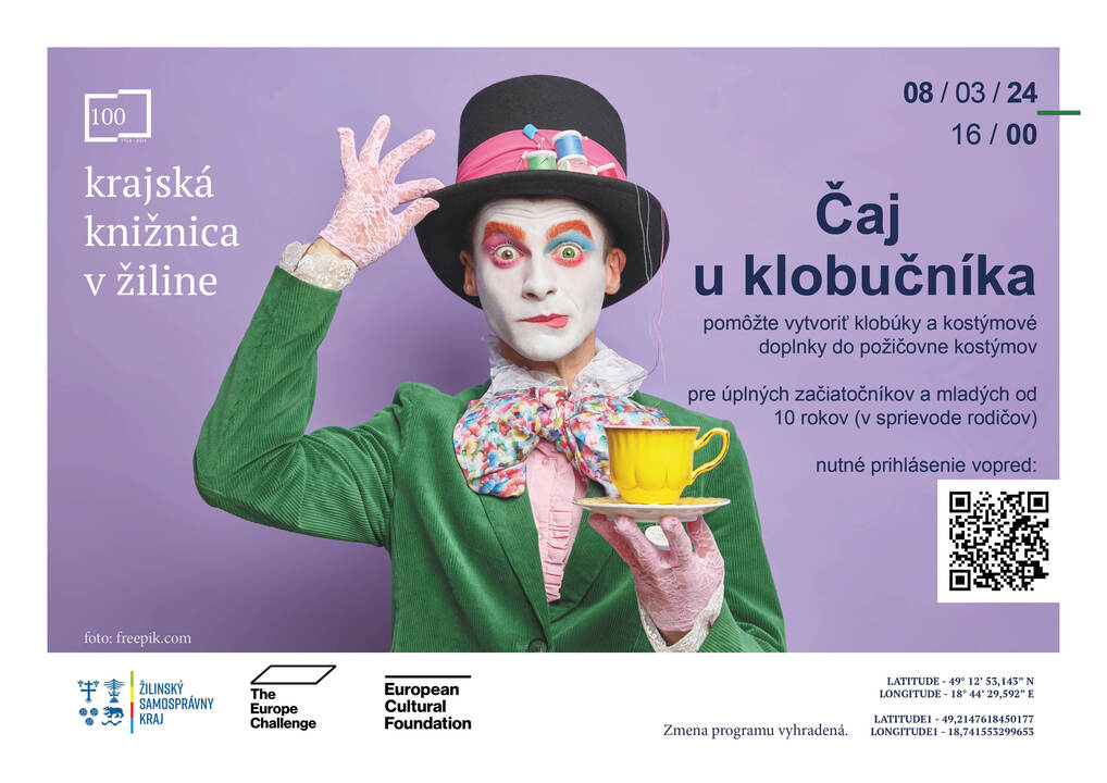 Koľko klobúkov nosíš, toľkokrát si človekom alebo kto chce mať pod čapicou, musí mať čapicu. Ak ste čítali Alicu v krajine zázrakov, možno ste túžili zažiť čajový večierok u Klobučníka. Príďte v piatok 8. marca o 16.00 a vychutnajte si šálku čaju a pomôžte nám vytvoriť klobúky a kostýmové doplnky do požičovne kostýmov. Z plsti vyrobíme klobúky a čiapky pre čarodejníka či čarodejnicu, princeznú a cínového vojačika. V prípade záujmu bude možné dokončiť minecraft prilby.