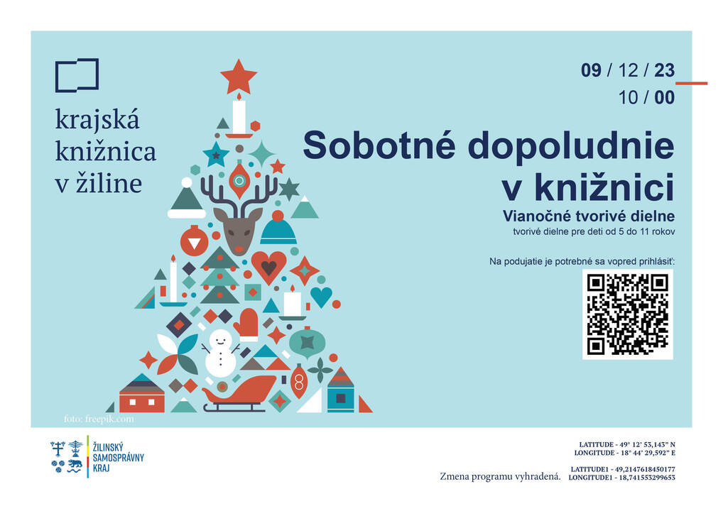 Rozprávanie o Vianociach spojené s tvorivými dielňami 9. decembra o 10:00 v Krajskej knižnici v Žiline. Podujatie je vhodné pre deti vo veku od 5-11 rokov. Podujatie je len pre registrovaných čitateľov. Je potrebné prihlásenie vopred: https://forms.gle/R5XPgJYVpyQh68qt9