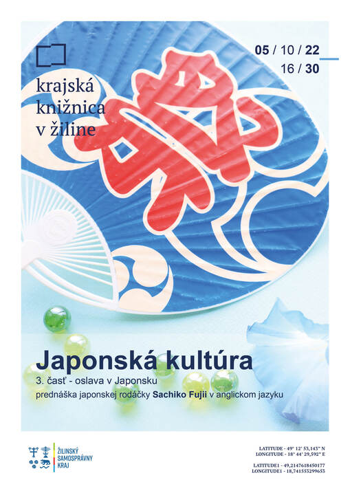 Zaujímajú vás dejiny kultúry, japonské kultúrne slávnosti, či letné festivaly? Japonská rodáčka Sachiko Fujii vám na 3. stretnutí o japonskej kultúre prezradí viac. Prednáška bude v anglickom jazyku v stredu 5. októbra o 16:30 v Krajskej knižnici v Žiline.