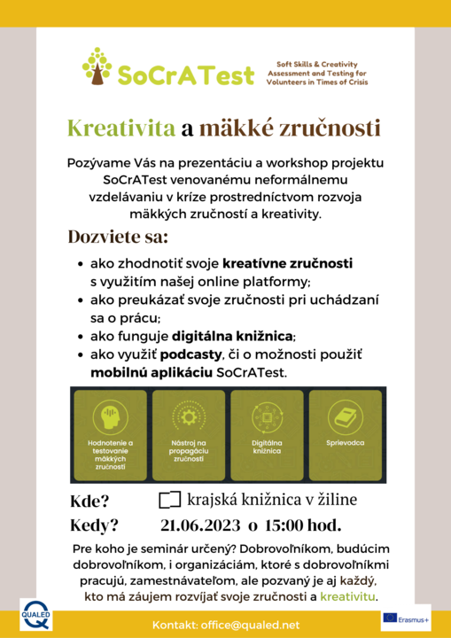 Pozývame Vás na prezentáciu a workshop projektu SoCrATest venovanému neformálnemu vzdelávaniu v kríze prostredníctvom rozvoja mäakkých zručností a kreativity. Ktorá sa uskutoční v Krajskej knižnici v Žiline 21. júna o 15:00.