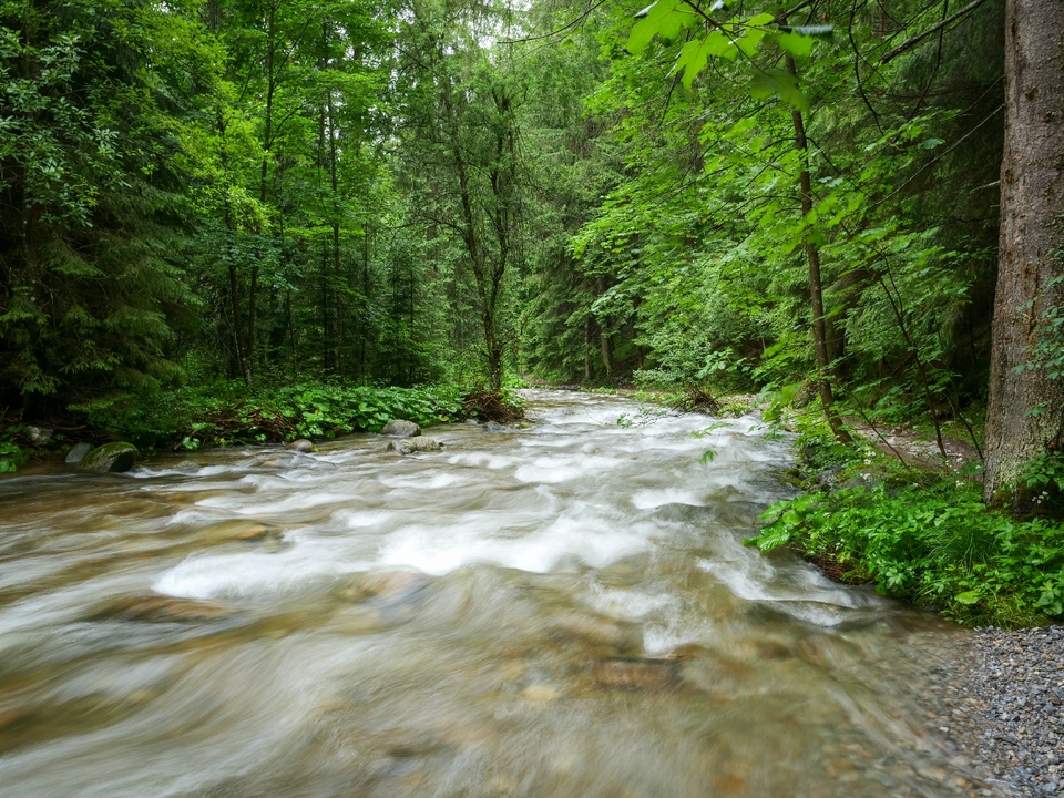 Trasa pokračuje vyššie ponad tok cez niekoľko malých mostíkov až ku existujúcemu odpočívadlu pri Riverside, kde sa pred mostom nachádza malá úvodná informačná tabuľa so smerovníkom s úvodom do témy a príbehom. Na konci lúky s ihriskom sa trasa znova norí medzi stromy a postupne sa pri nej vynára na jednej strane vodný tok, na druhej skalné útvary rôznych tvarov a veľkostí. V ohybe potoka je už z diaľky vidieť podivný útvar, veľký vyvrátený strom na okraji potoka. Tu je umiestnená zastávka reprezentujúca obrovskú (až ničivú) silu vody.