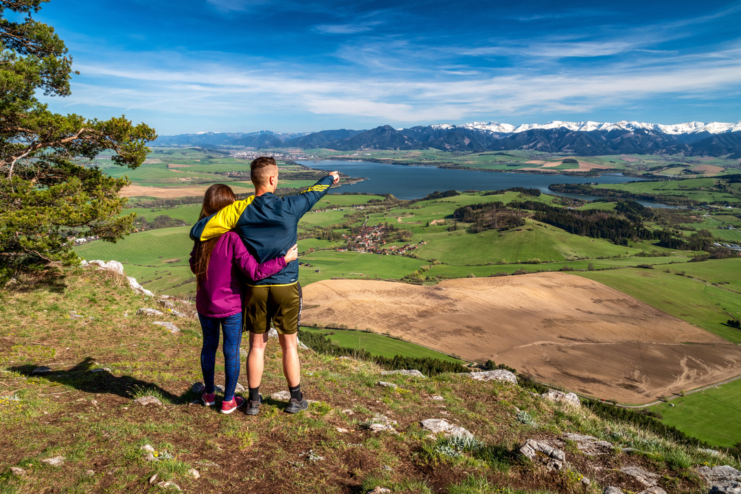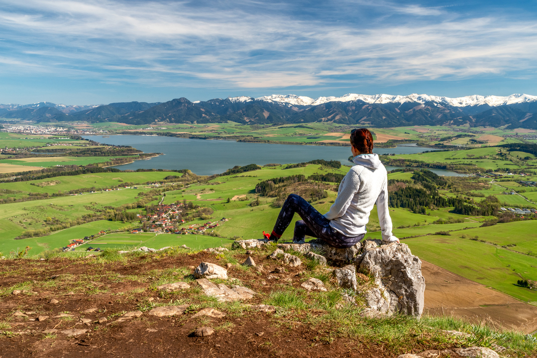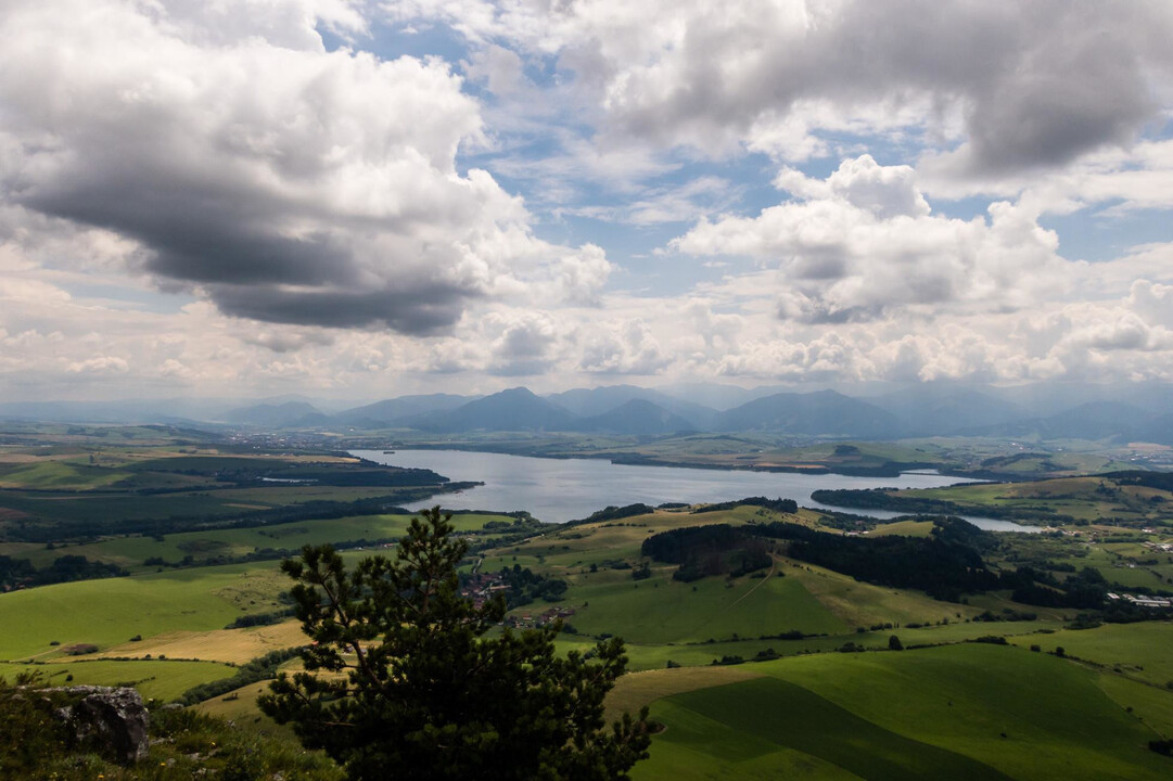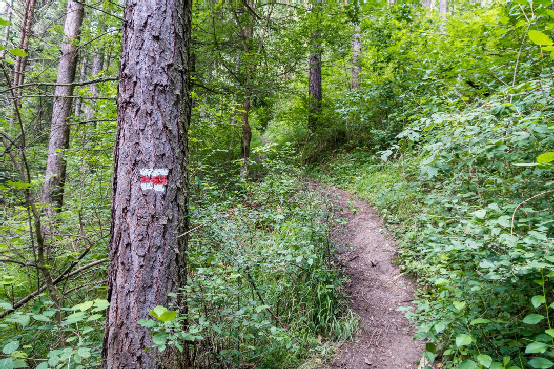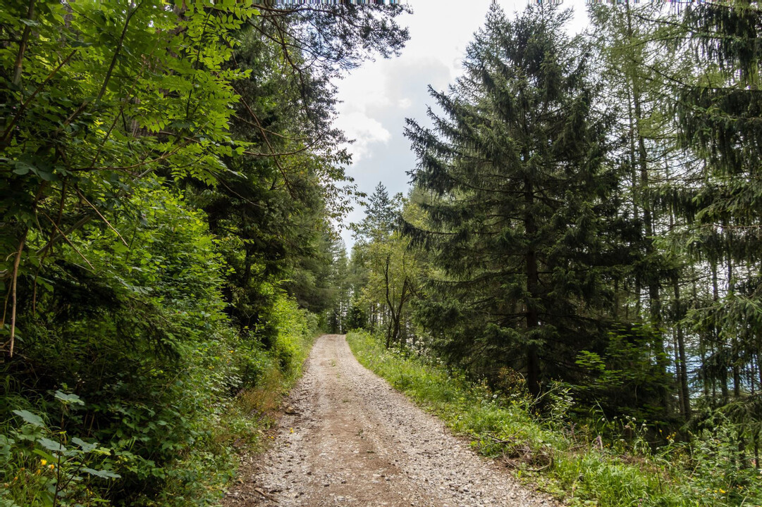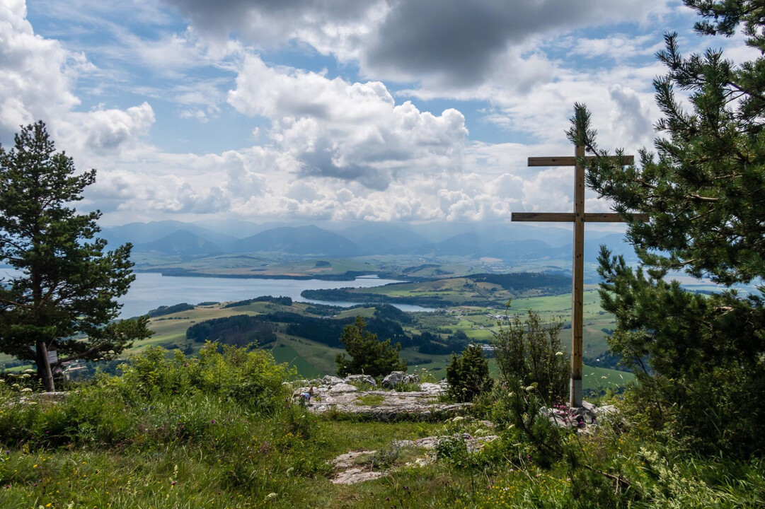 Tentokrát zo správnej zvážnice odbočuje do svahu nenápadný chodníček, kontrolujem pre istotu mapu a vydávame sa po ňom. Po nočnom lejaku je hlinitý povrch trochu šmykľavý. Z pravej strany sa po chvíli pripája ďalší a na moje prekvapenie sa na strome objavuje červená značka. Neviem kde jej trasa začína, ale toto vysvetľuje, prečo je chodník tak dobre vyšliapaný. Treba dodať, že svah je celkom slušná strmina. Pomedzi stromy sa občas objaví výhľad na Liptovskú Maru, výstup je síce namáhavý, ale nesmierne si ho užívam, lebo les vonia po nočnom daždi, zeleň je úchvatná – veď sme na Liptove v polovici júla!