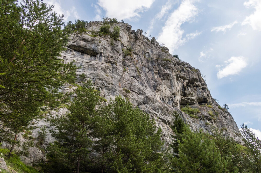 Vytrvalo stúpame, míňame výrazné sutinové pole a nad hlavami sa objavuje poriadny skalný útes. Skúmam peknú stenu, ale nikde nevidím skoby ani nity, možno sa tu naozaj nelezie. Hore sa objavuje kríž a vyhriata skala skutočne pripomína stôl, resp. vytvára veľmi pohodlnú lavicu, priam ideálnu na piknik. Na skale je namaľovaný koniec červenej značky, no nikde tu nie je smerovník. Kým rabujeme zásoby jedla z batohov, prenasleduje ma myšlienka na nenápadný chodníček, ktorý pred odbočením na skalnú terasu pokračoval ďalej do masívu Čerenovej. Jednak ma nenadchýňa predstava zostupu po rovnakej ceste a jednak mám chuť na ďalšiu improvizáciu. V digitálnej mape nachádzam neznačkovaný, ale zreteľný chodník, ktorý vedie úbočím a iba mierne križuje vrstevnice.